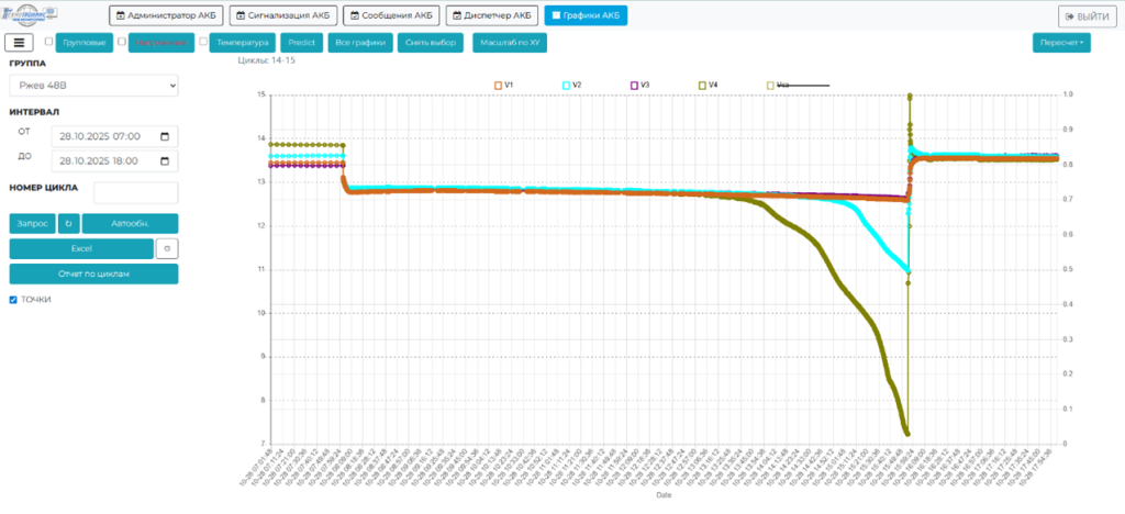 В начале 2025 года к нам обратилась компания с задачей мониторинга 4-х свинцово-кислотных аккумуляторов 12 вольт, находящихся на объекте в качестве резервного источника питания. При поставке системы мониторинга АКБ в виде контроллера АКБ-12/485 с модулем МКА4+ клиентом также было приобретено ПО «АКБ-Мониторинг». Данное программное обеспечение позволяет вычислять остаточную ёмкость аккумулятора за счёт измерения напряжения и тока при циклах разряд-заряд.