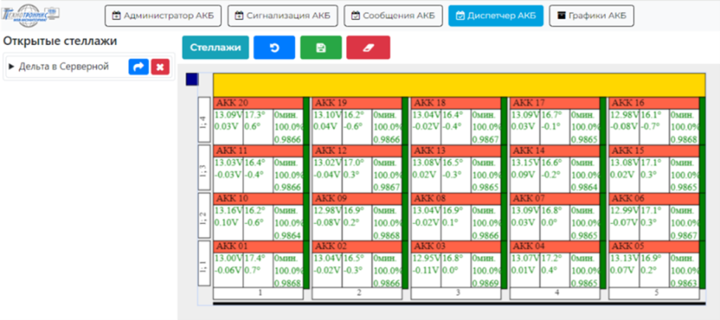 Просмотр параметров аккумуляторов в группах. Формат виртуальных стеллажей позволяет быстро найти каждый аккумулятор и узнать его текущие характеристики (рис. 4):