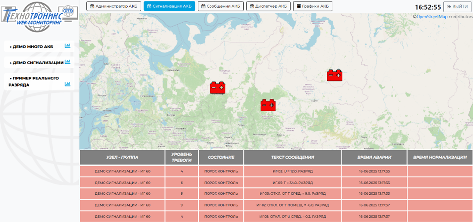 Визуализация объектов с АКБ на карте. На главной странице расположена самая важная информация для быстрого реагирования на возникающие события: карта объектов, таблица с аварийными сообщениями (рис. 3).