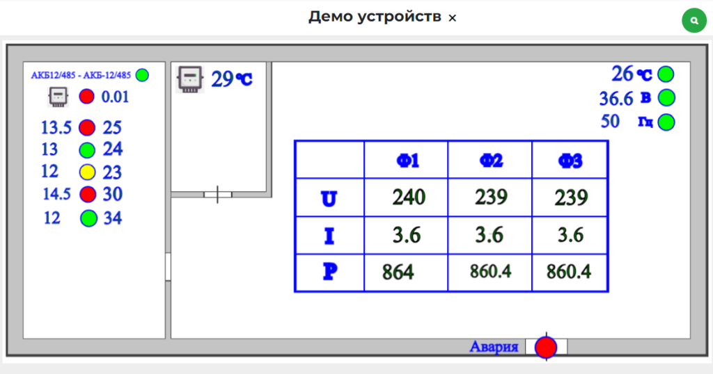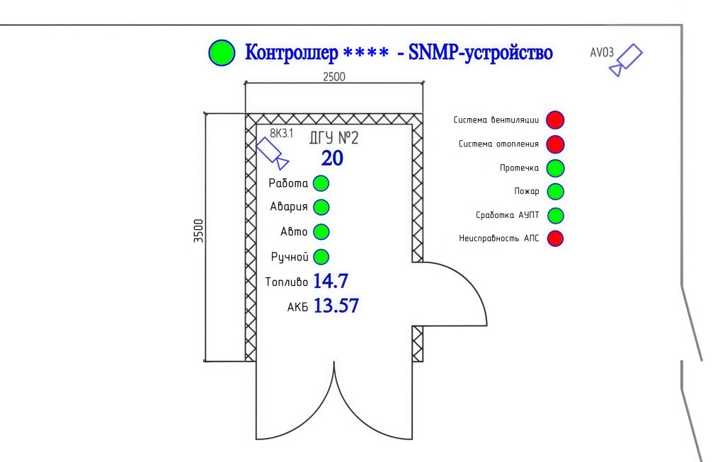 В новой версии ПО была реализована возможность добавлять сигналы сторонних SNMP устройств на мнемосхемы. Ниже представлен фрагмент мнемосхемы с отображением статуса и значения сигналов SNMP устройств.