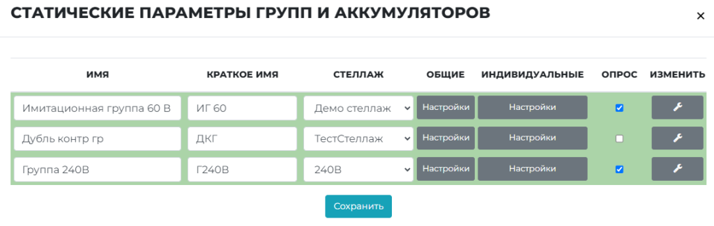 Теперь настраивать конфигурацию групп АКБ стало ещё удобнее - мы добавили возможность изменения прямо в модальном окне редактирования групп. Для этого достаточно нажать на новую кнопку «Изменить» - больше не нужно переходить к стеллажу, где расположена группа.