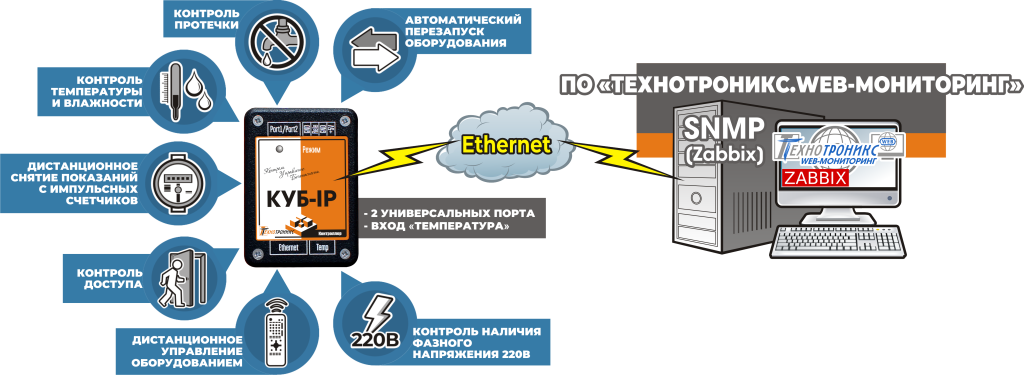 КУБ-IP – предназначен для контроля и мониторинга различных объектов через сеть Ethernet. Контроллер оснащен входом для датчика температуры и влажности, 2-мя многофункциональными портами, к которым могут быть подключены различные типы датчиков: открытия двери, затопления, задымления, вибрации/удара, снятия показания с импульсного выхода счетчика ресурсов и т.п.