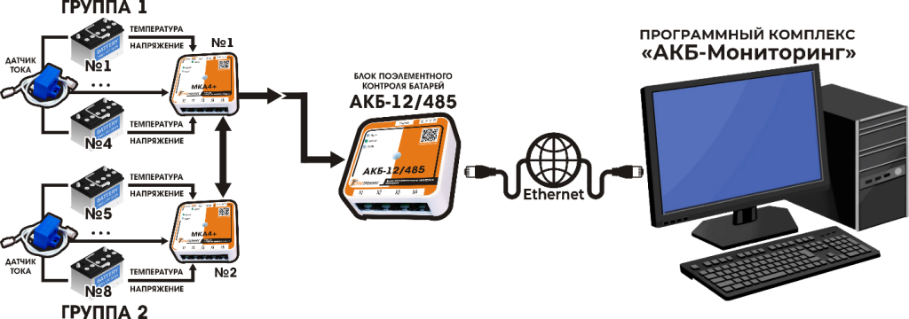 В составе аппаратной части системы мониторинга - контроллер АКБ12-485, модуль МКА4+ и датчики тока.- АКБ12-485 – контроллер, работающий совместно с модулем МКА4+. Передаёт данные от аккумуляторов в программное обеспечение;